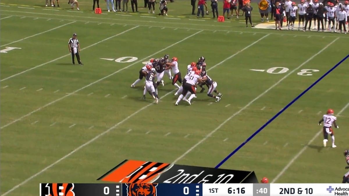 Things didn't start as the Chicago Bears hoped against the Cincinnati Bengals. The offense went three-and-out in their first three drives. Caleb Williams couldn't find a rhythm throwing the ball. The running game was stuck in neutral. His best play towards the end of the first half was drawing a 43-yard pass interference penalty that probably would've been a touchdown. Thankfully, head coach Matt Eberflus saw enough sense to realize the rookie needed more work. So the offense went out for one last drive with three minutes left.