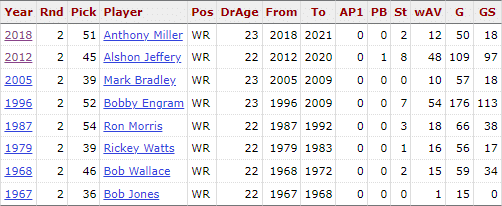 At the same time, history isn't on his side when it comes to that position. Since the start of the modern era in the late 1960s, the Bears have selected eight wide receivers in the 2nd round. Suffice to say, their batting average wasn't the greatest. Only of those eight managed to make a single Pro Bowl, and only one other lasted longer than five years in the NFL as a starter. One of those bigger disappointments was Anthony Miller, who the Bears' current scouting department drafted.
