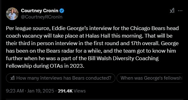 Jay Glazer dropped a bombshell on Saturday evening when he revealed the Chicago Bears planned to speak with Tennessee State head coach Eddie George. The former Pro Bowl running back first worked with the organization as part of the Bill Walsh Diversity Fellowship. It might explain their interest. However, others believe this is a calculated move by the organization to clear the final hurdle before pursuing their actual target. The NFL's Rooney Rule requires teams to meet with at least two outside minority candidates in person for their vacant.
