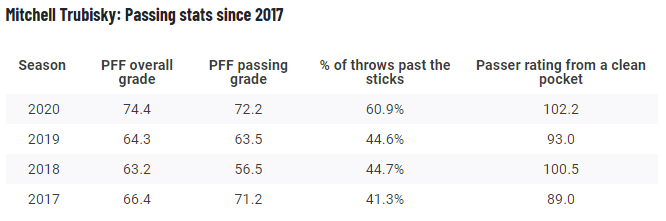 "Through two weeks, Trubisky has played at a level we haven't seen from him in a long time. He earned an 80.2 PFF grade against the Giants, his best single-game grade since Week 12 of the 2018 season. All of a sudden, Trubisky was the one being let down by his teammates — not the other way around. He completed 64.3% of his passes, but he had two key passes dropped, both on third down, and one of which would have been an absolute dime of a touchdown."