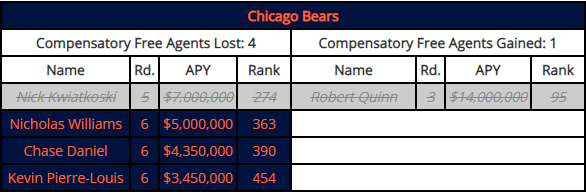 However, there is an undercurrent to how the Bears have operated to this point. Aside from Quinn, their acquisitions have either been re-signings of their own players or players like Graham who were cut by their previous team. Why would they do this? The answer rests on the 2021 draft. Namely the idea of stockpiling compensatory draft picks.