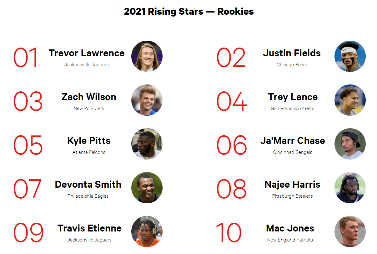 Could Fields be different? The NFL Players Association seems to think so. They released their annual list of rookies and veterans who are poised for breakout seasons. Players they feel will be among the best not just on the field but also in terms of moving merchandise. Of the top 10 rookies listed, Trevor Lawrence was #1. Hardly a surprise given his status as the 1st overall pick. Yet right behind him at #2?