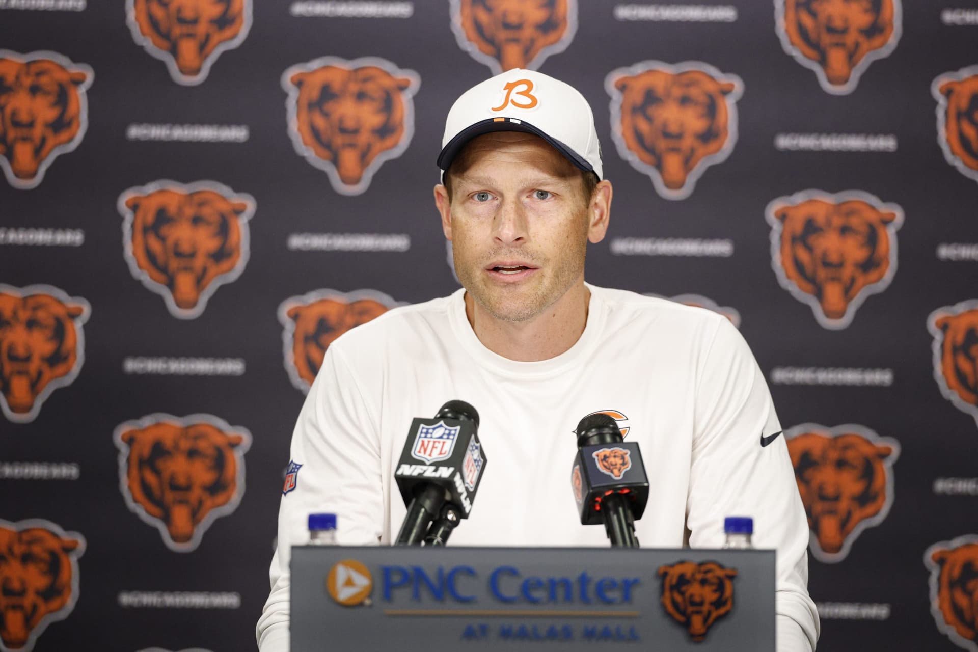 The starting offense had another rough showing during early 11 on 11 drills. Issues included a high snap over Caleb Williams, consistent pressure from Grady Jarrett, and a stumble on a scramble. The group had to reset mid session to clean up huddle and alignment mistakes—reminders that details still need to be cleaned up.