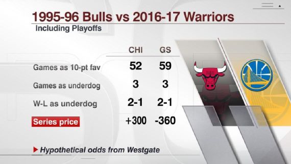 ESPN spoke to six Vegas oddsmakers regarding who would be favored in a heavyweight bout between the 2017 Warriors and '96 Bulls. And while it wasn't unanimous, five of the six had this years Golden State team favored by as high as -8 at the MGM (per Jay Rood, vice president of race and sports at MGM Resorts) to as low as -2 at William Hill US (per Nick Bogdanovich, director of trading, William Hill US).