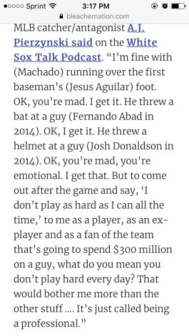 Listen, there are players on every team that don't hustle and give it their all 100% of the time. That's almost impossible to do over a 162 game season. But A.J. does still have a point. If you don't hustle, don't just go out after a game and openly tell the media that. It's a bad look for him in the eyes of the public and the teams who will look to sign him this winter. Don't get me wrong, I still want Machado on the White Sox, and I'm sure I'm not the only one. He's a top 5 player in all of baseball and can win baseball games by himself. That doesn't seem to matter to A.J. though. In time we'll see just how much Machado's comments matter to the White Sox front office as well.