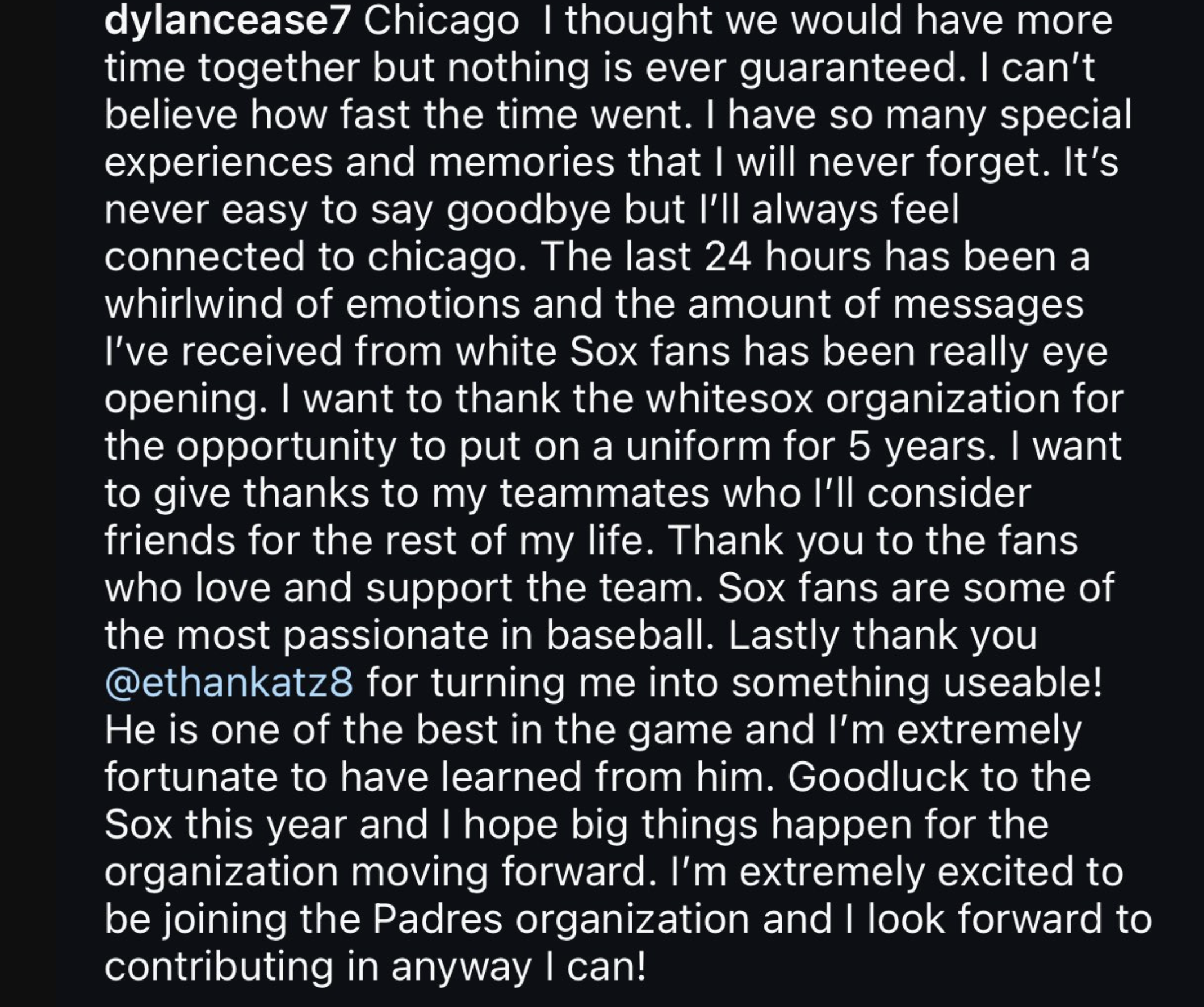 “Thank you to all the fans who love and support the team. Sox fans are some the most passionate in baseball,” Cease wrote in his farewell message. “Good luck to the Sox this year and I hope big things happen for the organization moving forward.”