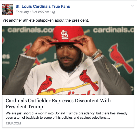 So, let's go to the Facebook page, St. Louis Cardinals True Fans, where the hate-filled comments came from. Here's the article posted to the page, coming from 12UP.com.